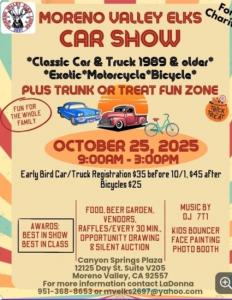 Get ready, car lovers, families, and Halloween enthusiasts — the Moreno Valley Elks Lodge #2697 is revving up for one of the most exciting community events of the season! The Moreno Valley Elks Charity Car, Truck, and Motorcycle Show will take place Saturday, October 25, 2025, from 9 a.m. to 3 p.m. at Canyon Springs Plaza, 12125 Day St., Suite V205, Moreno Valley, CA 92557.